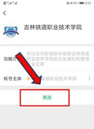 第七步:点击“关注”按钮,关注“吉林铁道职业技术学院”微信公众号,如图: