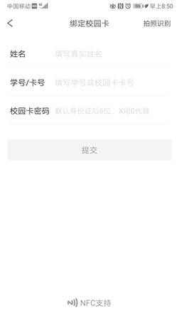 在“完美校园”这个APP顶部正中间,有一个“校园卡认证”按钮,点击进入,然后,输入姓名、卡号、密码,然后,点击提交,即可绑卡成功。