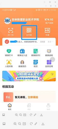 打开“完美校园”这个APP,上部正中间有一个“去付款”,点击后出现一个二维码,然后,把手机屏幕对准消费机等设备,听到提示音后表示交易成功。另外,首次消费前请先充值。