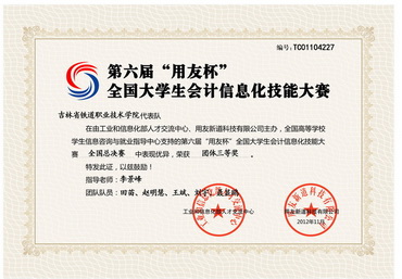 我院由经济管理系学生组成的两代表队,于2012年11月24日参加了在“吉林财经大学”举办的第六届“用友杯”全国大学生会计信息化技能大赛。本次大赛是吉林省本科和大专院校参赛较多的一次,共50多支队伍参赛,我院两支代表队在大赛中分别获得国家三等奖和省级一等奖。